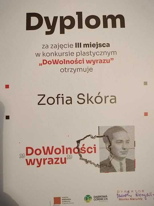 Zosia Skóra, uczennica klasy 8b, została laureatką Regionalnego Konkursu pt. „Do wolności wyrazu”, który został zorganizowany z okazji rocznicy odzyskania przez Polskę niepodległości. Zosia dokonała plastycznej interpretacji wiersza Tadeusza Kubiaka „Tu wszędzie Polska”, dzięki czemu zdobyła III miejsce. Gratulujemy kolejnego sukcesu Naszej uczennicy!