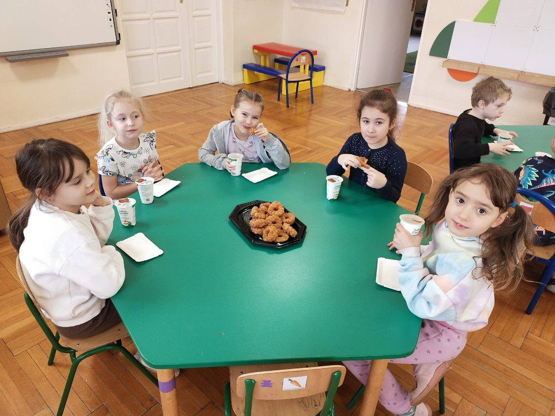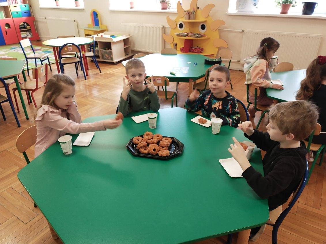 Nie zabrakło rozmów o ulubionych smakach, zabaw tematycznych oraz prac plastycznych inspirowanych słodkościami. Najwięcej uśmiechu pojawiło się oczywiście podczas degustacji – pączki smakowały wyśmienicie!